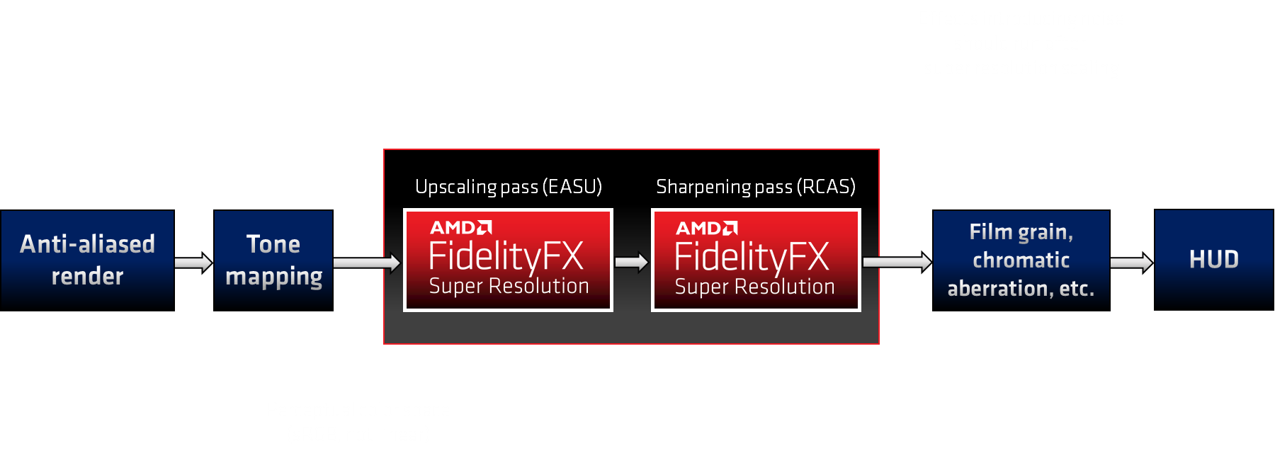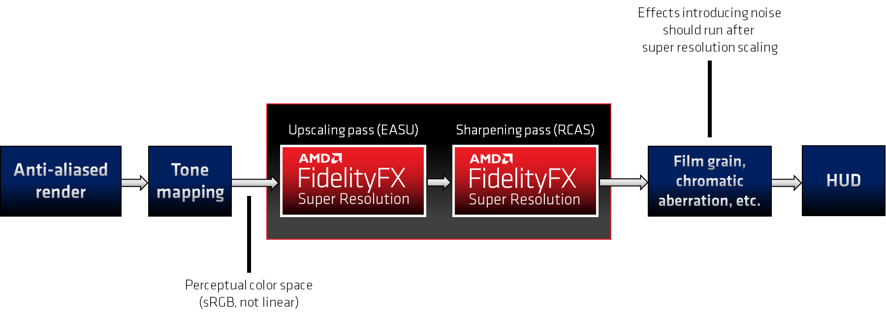 AMD FidelityFX Super Resolution passes work best in perceptual color space, and should therefore be integrated after tone mapping. Passes that introduce noise or other high-frequency visual components to the scene should be rendered after upscaling to avoid those noisy components being amplified.